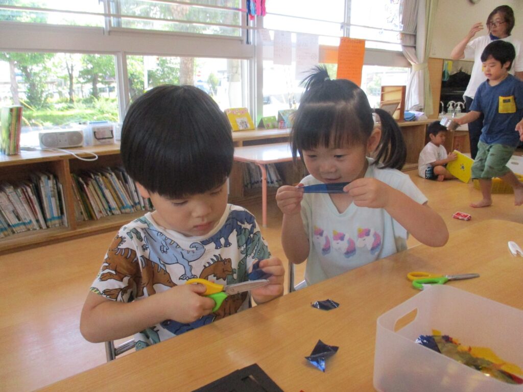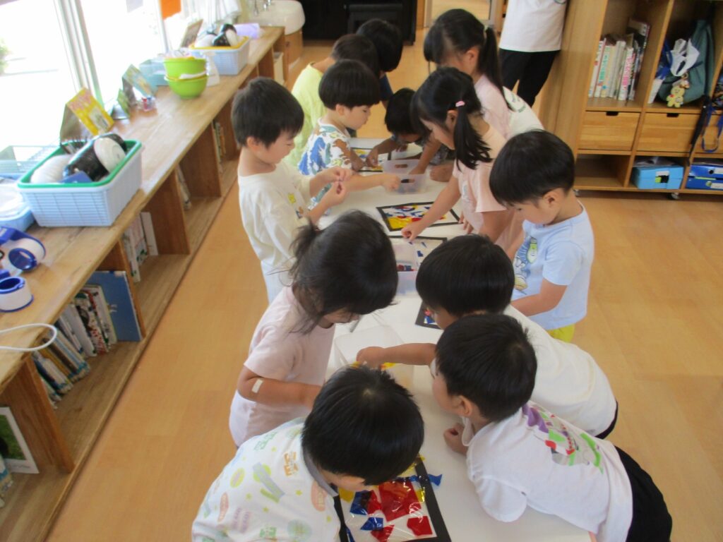みんなでステンドグラスを作りました。カラーセロファンを切り、好きなところに貼りつけました。完成すると、「きれい~!」とうれしそうに眺めていました。