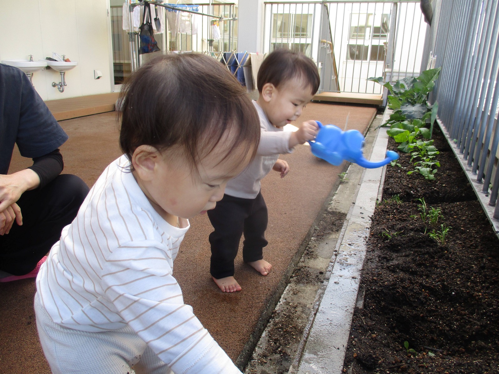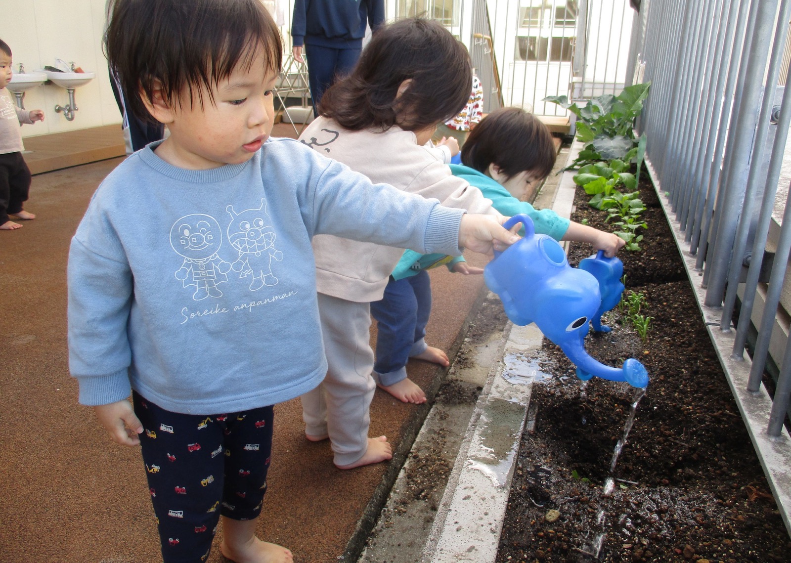 テラスの畑でかぶとほうれん草を育てています。毎日水やりをして生長を楽しみにしている子どもたちです。