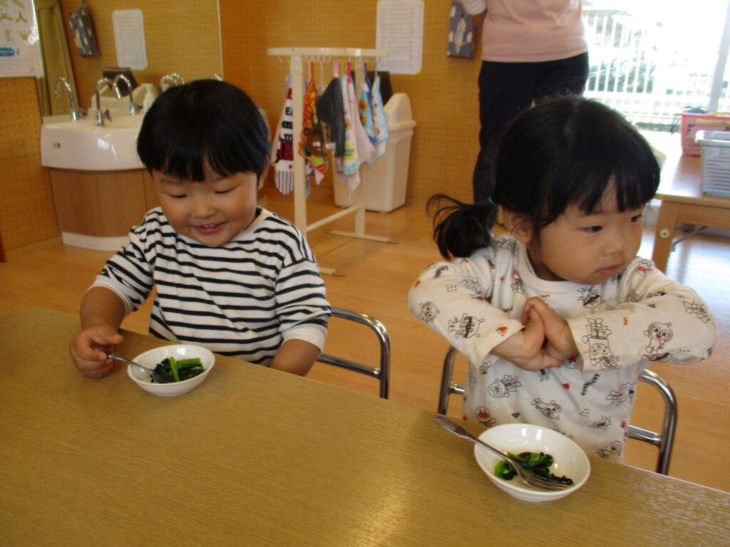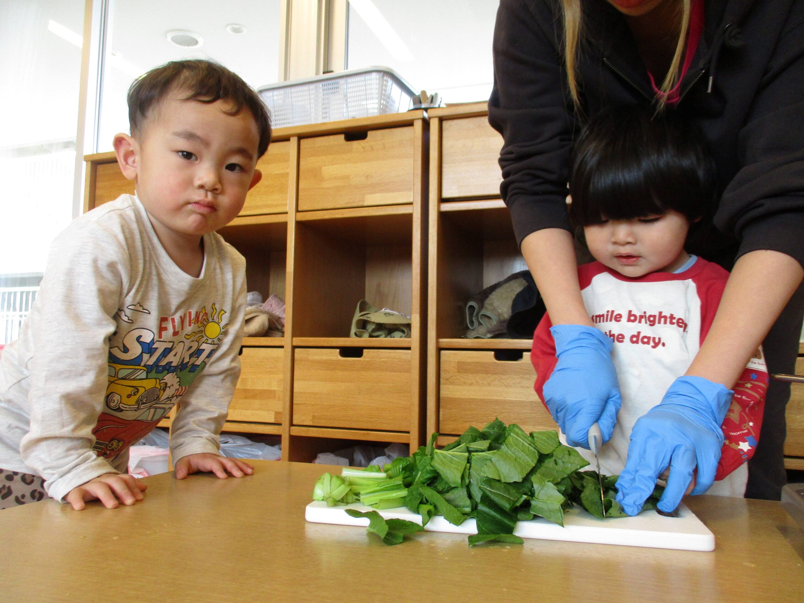 育てていた小松菜が大きくなったので、収穫してクッキングをしました。洗ったり、包丁で切ったりする工程を楽しんでいました。小松菜のおかか和えができあがると「おいしい~」と言っていた子どもたちです。