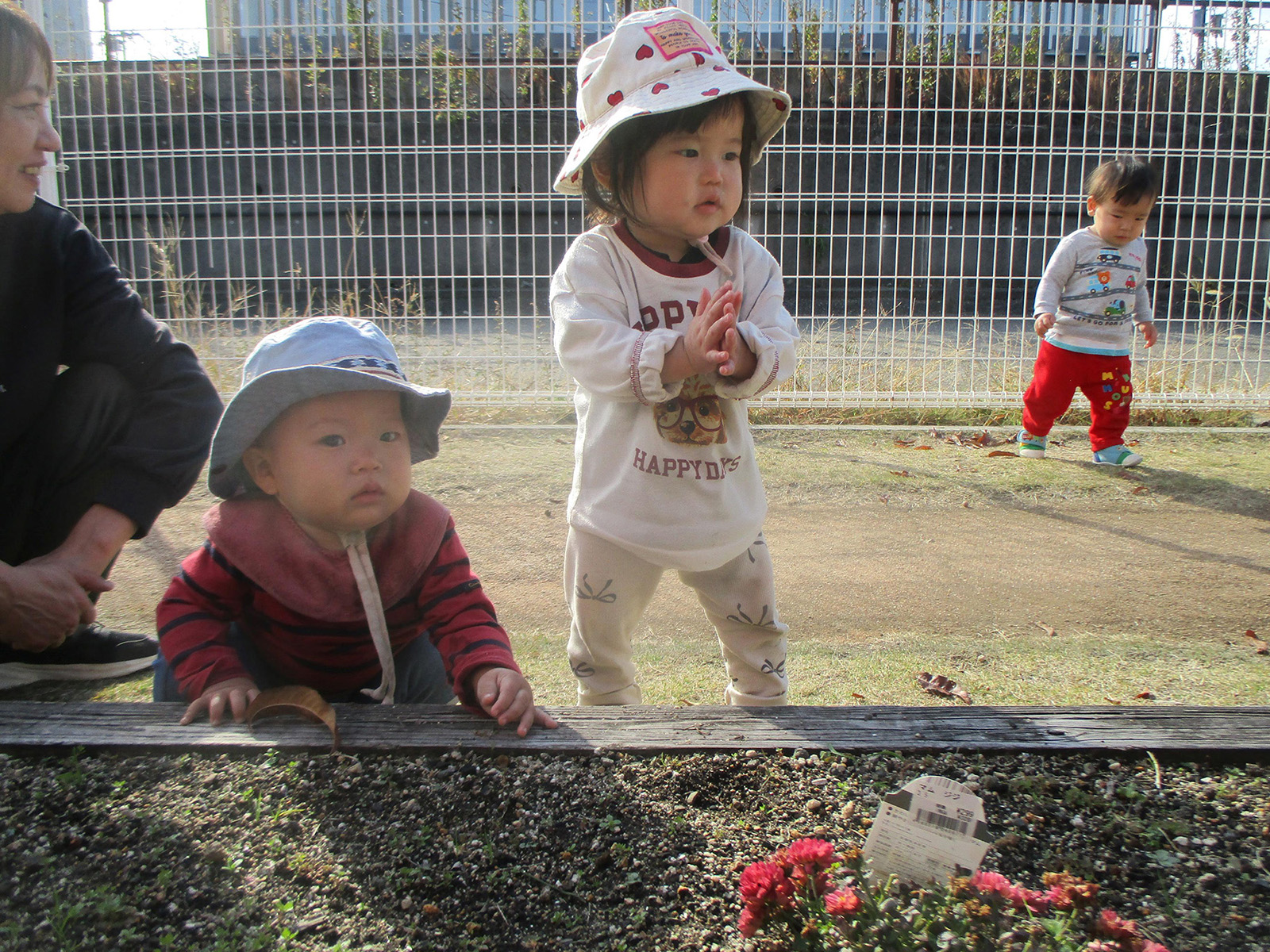園周辺や近所の介護施設の庭におじゃまして、散歩を楽しんでいます。きれいなお花を見たり、電車に手を振ってうれしそうにしていました。