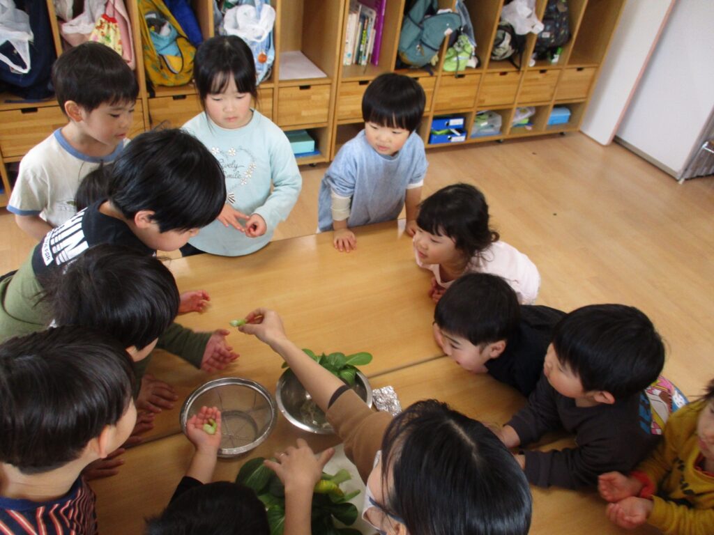 育てていたチンゲン菜を収穫して、スープに入れて食べました。「おいしい~」とたくさん食べていた子どもたちです。