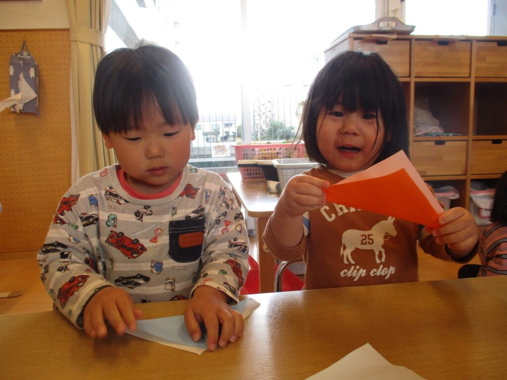 保育士と一緒に折ったり、折っているところを見て、見よう見まねでチャレンジしたりと折り紙を楽しんでいました。
